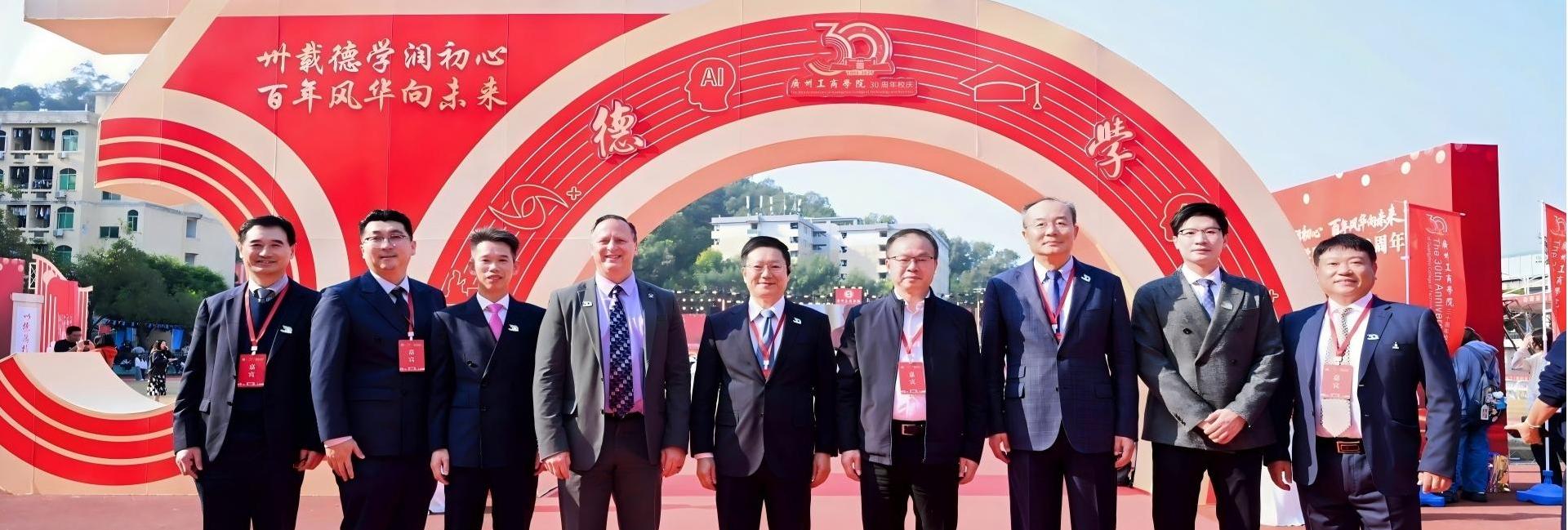 广州工商学院董事长、校长吴卫洁教授和终身名誉校长邝邦洪向东北州立大学校长Dr. Rodney Hanley回赠礼物