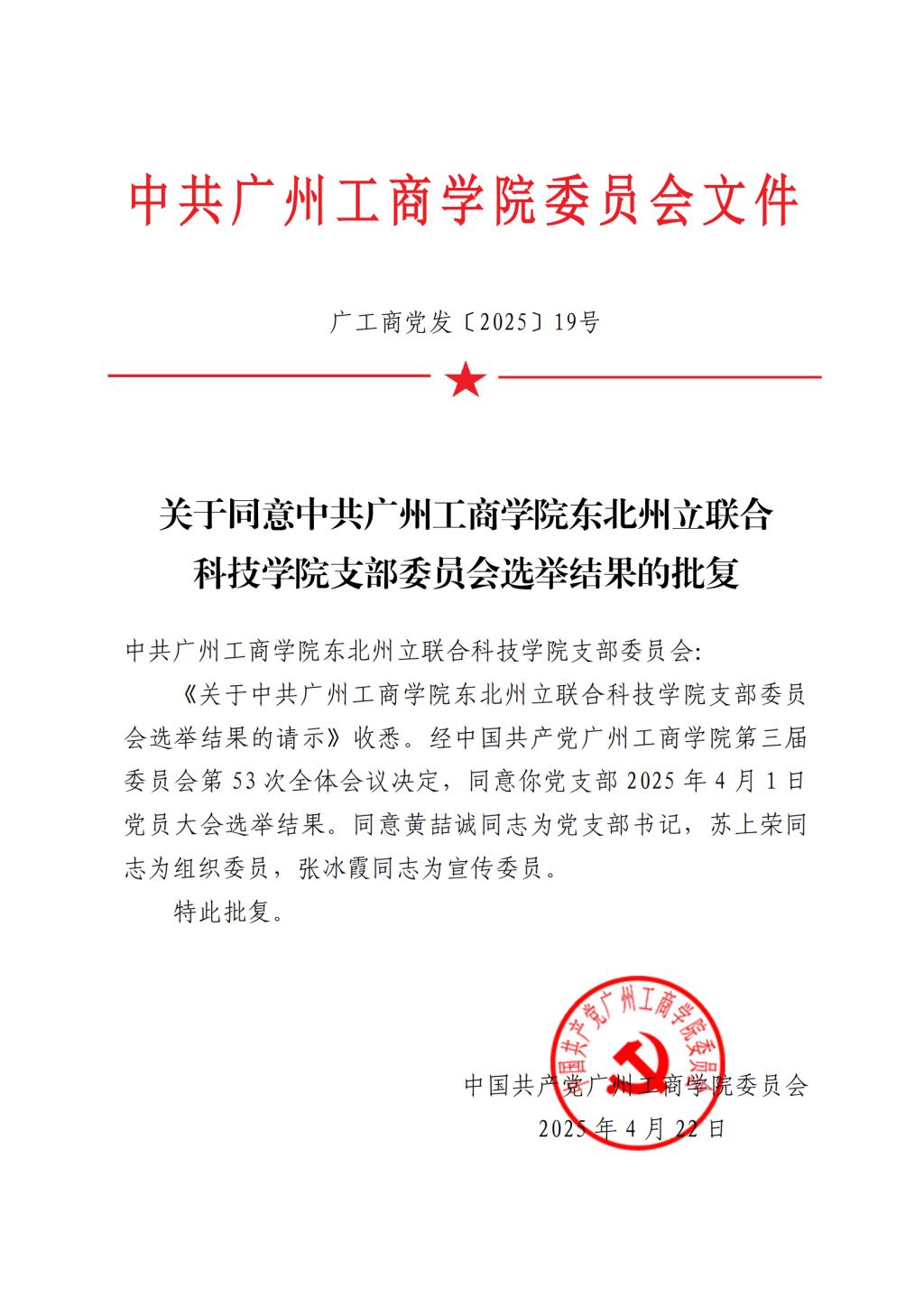 2025年4月22日,中国共产党广州工商学院委员会下发了《关于同意中共广州工商学院东北州立联合科技学院支部委员会选举结果的批复》(广工商党发〔2025〕19号),正式同意广州工商学院东北州立联合科技学院党支部于2025年4月1日召开的党员大会选举结果,由黄喆诚同志任党支部书记,苏上荣同志任组织委员,张冰霞同志任宣传委员。
