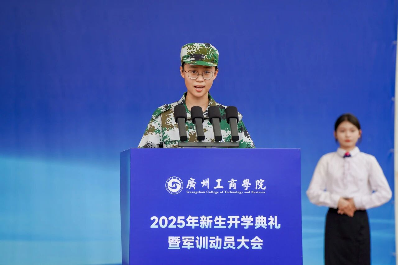 9月9日上午,广州工商学院2025级新生开学典礼暨军训动员大会在田径场隆重举行。联合科技学院2025级大数据中外合作办学B1班胡凯慈同学作为新生代表登台发言,以“以青春之名,赴时代之约”为题,表达了全体参训学员迎接挑战、锤炼自我的坚定决心。