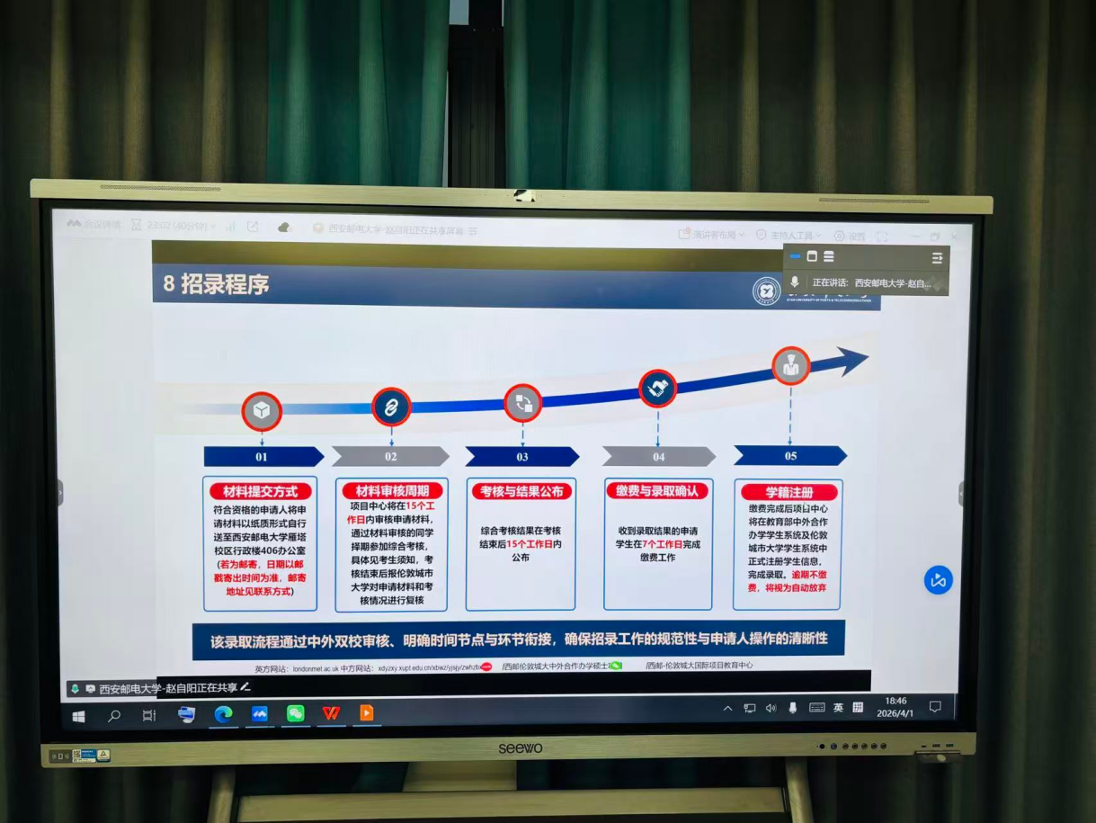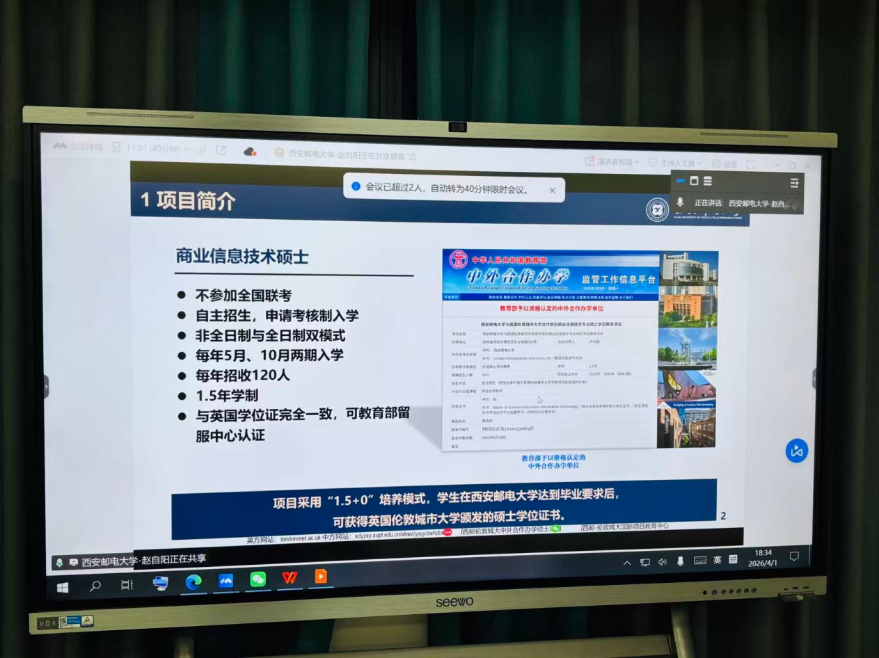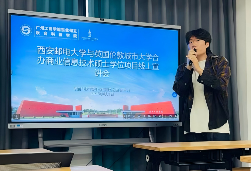 为切实拓宽学生升学渠道,搭建优质升学平台,助力学生实现更高质量的学业发展,2026年4月1日,联合科技学院特别邀请到西安邮电大学现代邮政学院学术骨干,硕士生导师赵自阳老师,对西安邮电大学与英国伦敦城市大学合办商业信息技术硕士学位项目进行宣讲。本次宣讲会精准对接学院部分学生升学需求,现场互动热烈,切实为学生及家长解答升学困惑,彰显了学院升学指导办公室在助力学生成长成才方面的扎实努力。